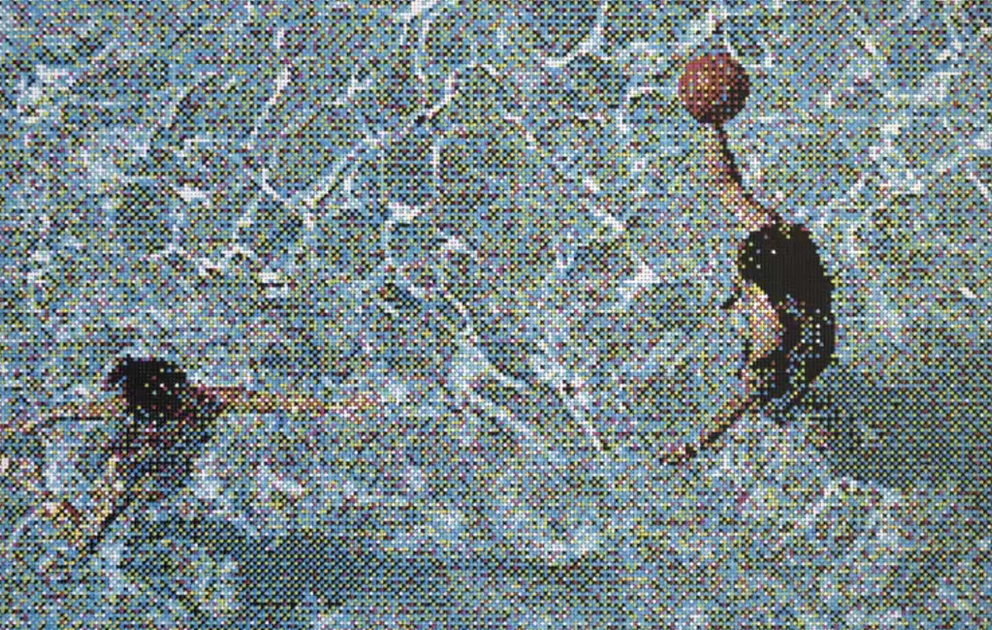 Painted through surveillance software. Dots instead of brushstrokes. A figure almost lost in the heat shimmer. This is digital summer: flattened, aesthetic, and a little voyeuristic. You know this girl. She’s in your memories, and your feed.
